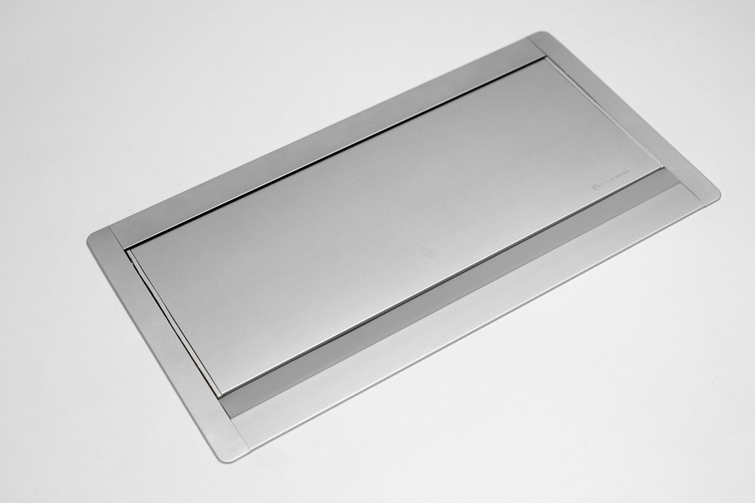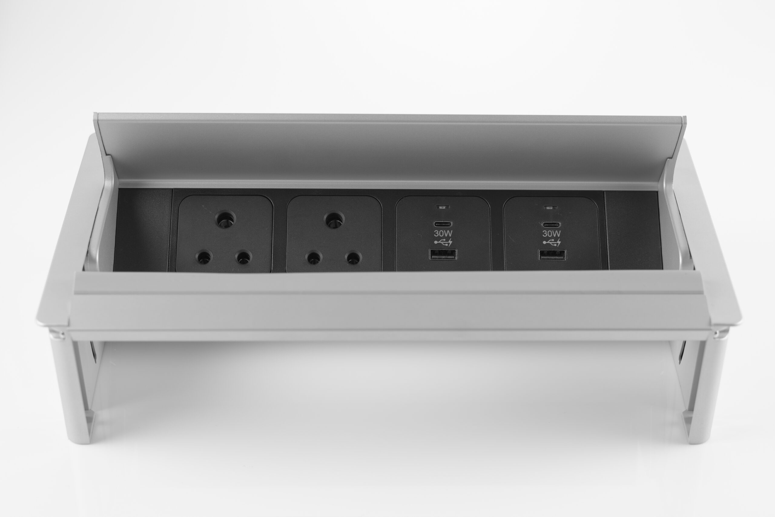 NETBOX Axial is a built-in solution that closes flat and flush against its mounted surface. It opens from the front to reveal power, voice, and data sockets whenever required.