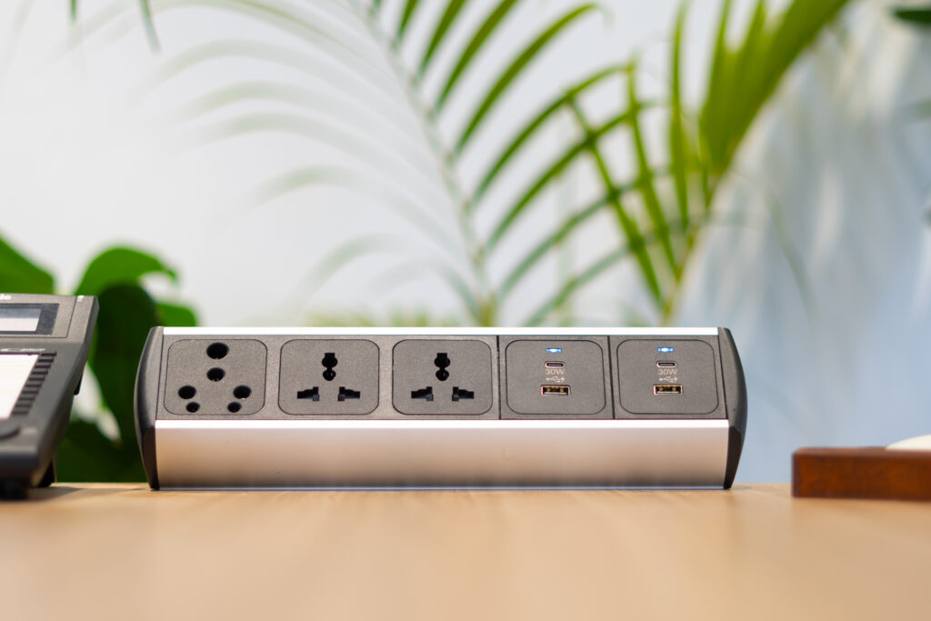 NETBOX Smart is a detachable desktop mounted power & data unit in aluminium finish.