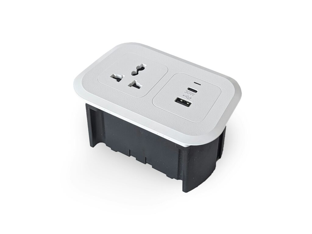 NETBOX Flush is a built-in unit with dual module of your choice. Designed to blend with any environment seamlessly, the NETBOX Flush sits flush with your workspace surface. It features a rounded edge and aesthetic contemporary look.