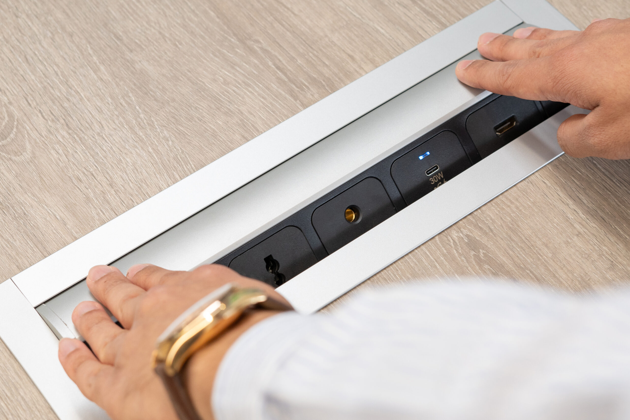 NETBOX Turn Comfort permits access from any angle, making it a highly flexible solution. Since cables run below the table, the unit’s sleek look is enhanced—especially in table tops with a minimum thickness of 10 mm—and it is available in customizable lengths.